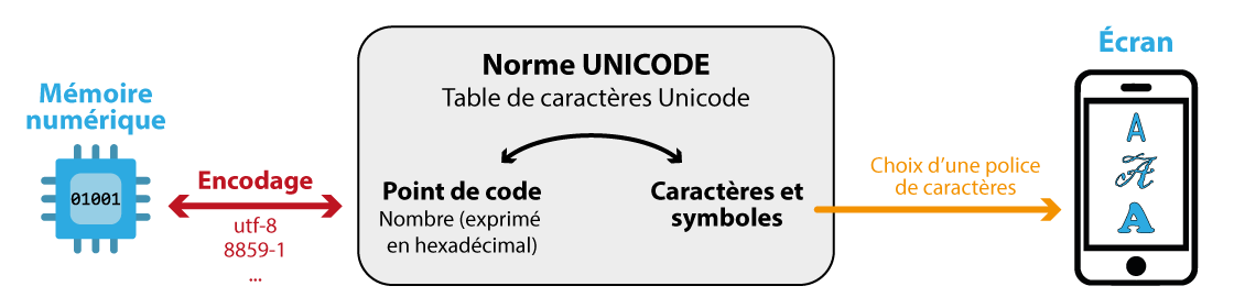 L'unicode ne définit pas la façon dont les points de code vont être représentés en mémoire par des 0 et des 1.