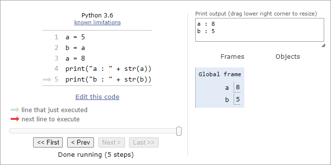 On observe que les variables a et b sont indépendantes. C'est toujours le cas pour des variables dont le type est non mutables.