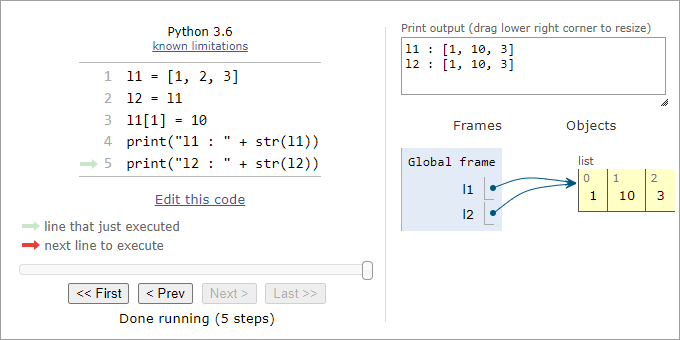 On observe que les variables l1 et l2 font référence au même objet mis en mémoire et ne sont donc pas indépendantes. C'est toujours le cas pour des variables dont le type est mutables.