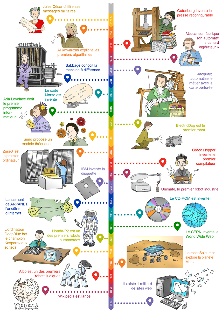 Les premières traces d’algorithmes ont été retrouvées chez les Babyloniens (l’actuel Irak) au deuxième millénaire avant notre ère et étaient principalement des méthodes de calcul pour le commerce et les impôts. Il faut attendre le troisième siècle avant J.-C. en Grèce pour l’apparition du fameux algorithme d’Euclide pour le calcul du PGCD (Plus Petit Diviseur Commeun) : on peut considérer qu’il s’agit du premier algorithme « moderne » et il est tout à fait remarquable qu’il soit toujours utilisé de nos jours.