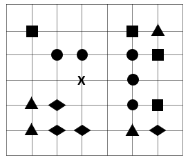 On a représenté sur un quadrillage les éléments de quatre classes (chaque classe est représentée par un carré, un triangle, un losange ou un disque) ainsi qu’un nouvel élément X.