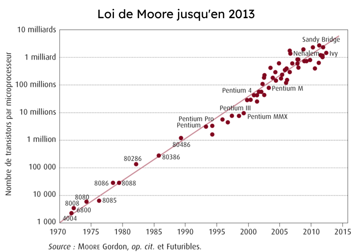 | 1989 | Intel 80486 | 1 200 000 (800nm) | 1 000 à 800 | 16 à 100 MHz | 32 bits/32 bits bus | 20 |