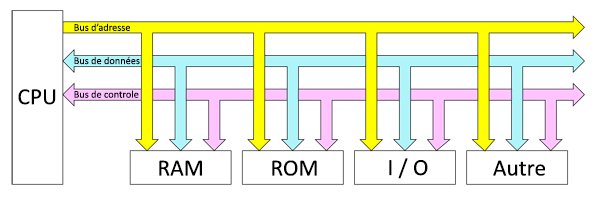 - le bus de commandes ou de contrôle : contrôle l'accès et l'utilisation des deux autres bus.