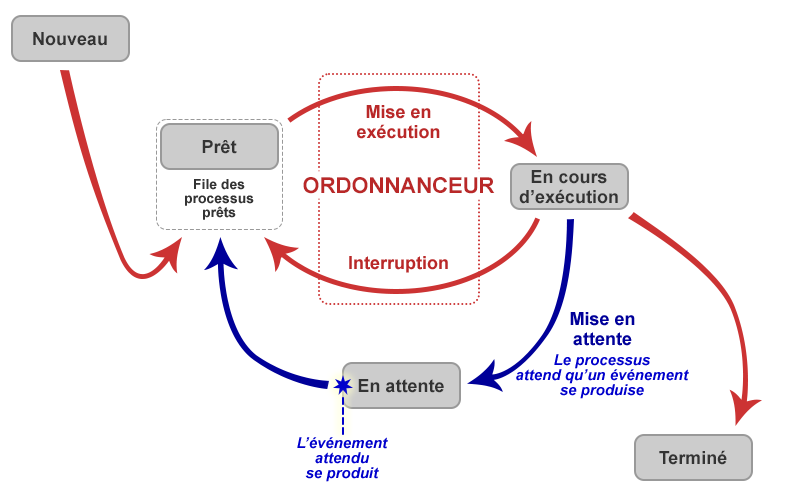 Dès que l'évènement attendu se produit, le processus est remis dans la file des processus prêts.