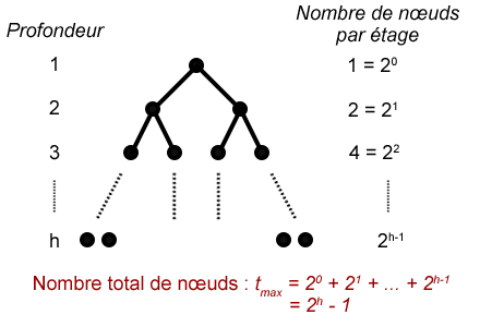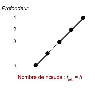 1) Quelle est la plus petite taille \(t_{min}\) d'un arbre binaire de hauteur \(h\) ? En déduire une inégalité entre \(t\) et \(h\).