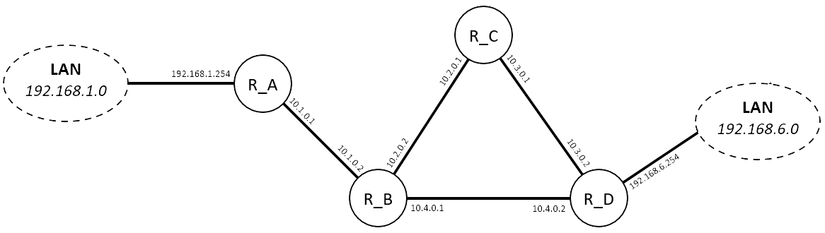Ainsi, à chaque liaison entre routeurs est attribué un coût \(C\) définit par une relation du type : \(C = \dfrac{D_{ref}}{D}\) où \(D_{ref}\) est le débit de référence et \(D\) est le débit de la liaison, en \(\pu{bits/s}\).
