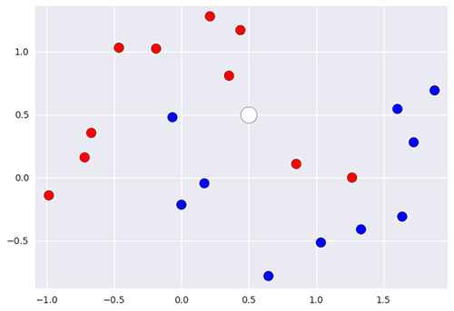 - - compter le nombre de points rouge et de points bleu parmi ces voisins,