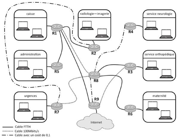 4. Avec le protocole OSPF, donner le chemin pris par un paquet partant du service de neurologie à destination du service d’imagerie.