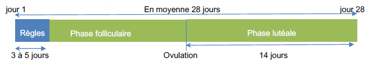 Le cycle menstruel désigne l’ensemble des transformations physiologiques cycliques qui se répètent en moyenne tous les 28 jours chez une femme, de la puberté à la ménopause. Il est constitué d’une succession de deux phases séparées par l’ovulation. Avant l’ovulation, on définit la phase folliculaire, après l’ovulation, on définit la phase lutéale. Par convention, le cycle menstruel commence le premier jour des règles. L’ovulation se réalise toujours 14 jours avant le début des menstruations. Le schéma ci-dessous résume ce cycle.